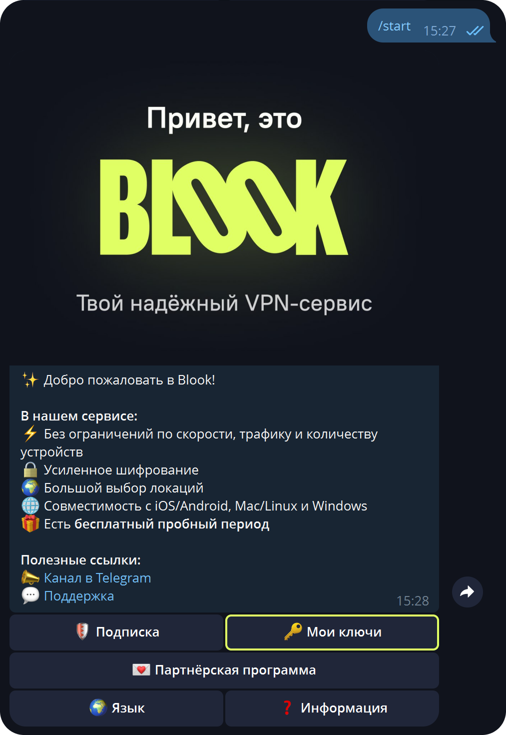 Для дальнейшего добавления вашего ключа/подписки в одно из приложений, вам необходимо сначала в боте создать ключ/подписку.