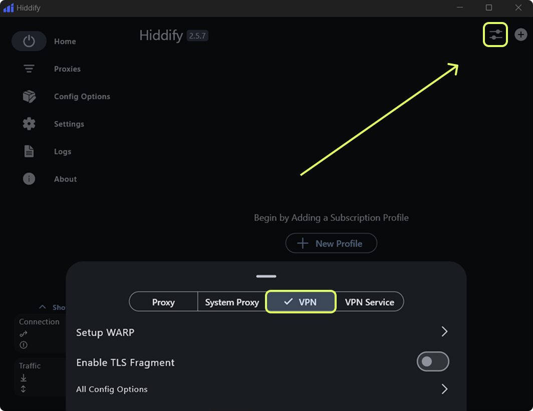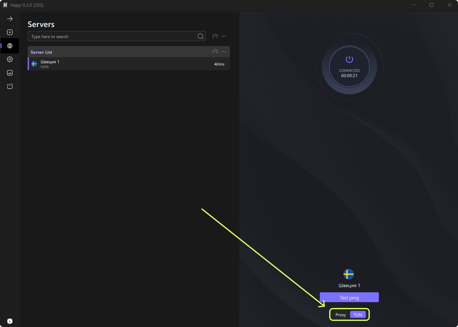 1. [ПК]: Убедитесь, что у вас включен режим "TUN":